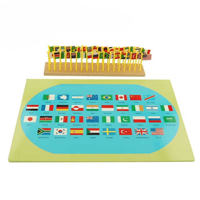 البلدان في جميع أنحاء العالم وتلهم اهتمامهم بتعلم الثقافات والعادات المختلفة.٣٦ علمًا من جميع أنحاء العالم مع خريطة خشبية وحامل.