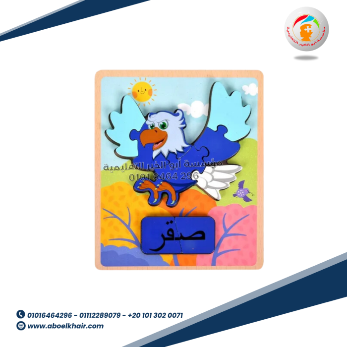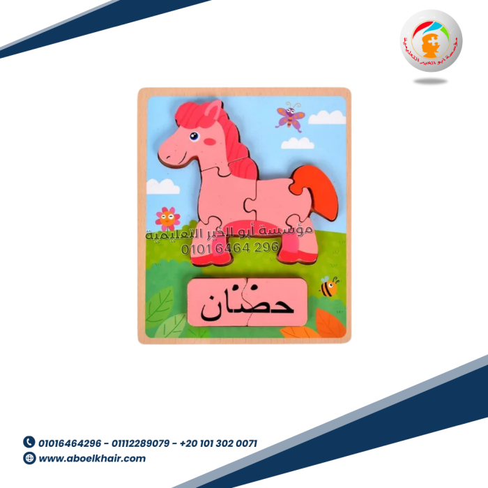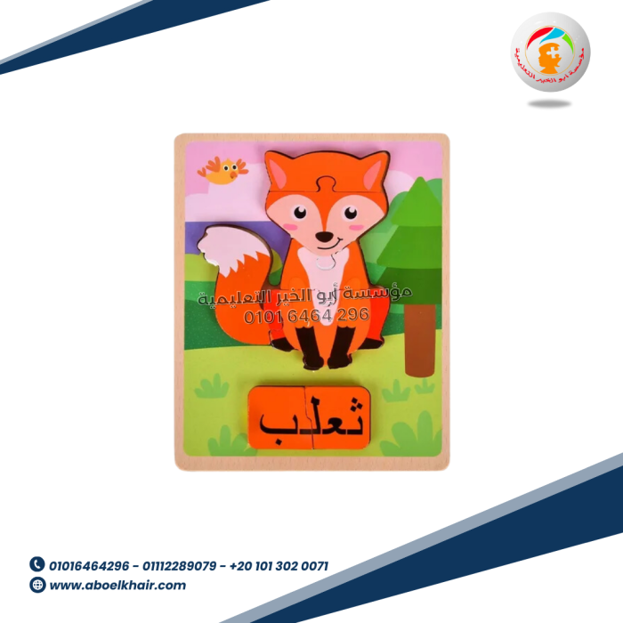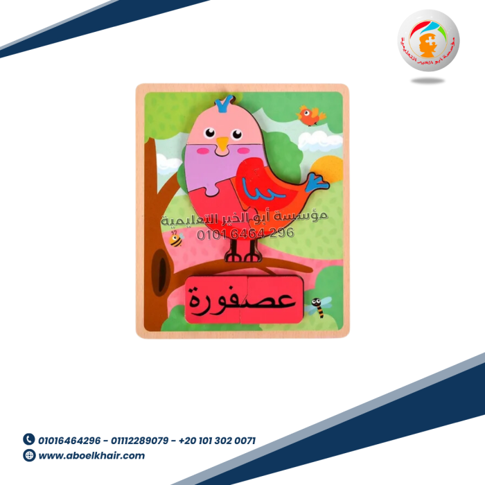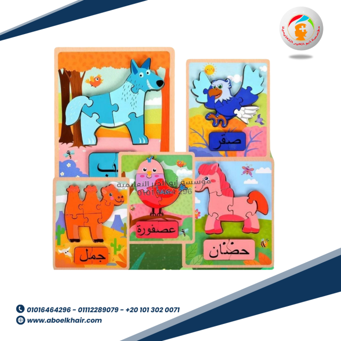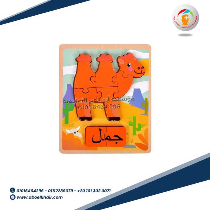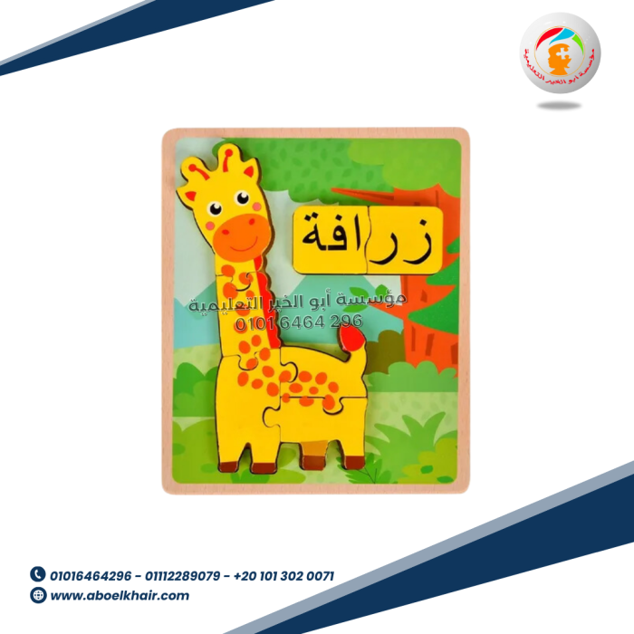 عبارة عن كارت خشبي عالى الجودة بها قطع مجسمة بسيطة سهلة التركيب مع بازل حروف بالعربي اسم شكل البازل
