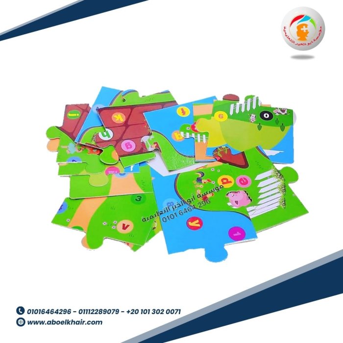 🧩اللوحة البازل مقسمة الي 9 قطع و هناك خطوط كفاف علي القالب و احرف صغيرة يقوم الطفل بإدخال الشكل المرسوم الي القاعدة و البحث عن الحرف أو الرقم المقابل للشكل