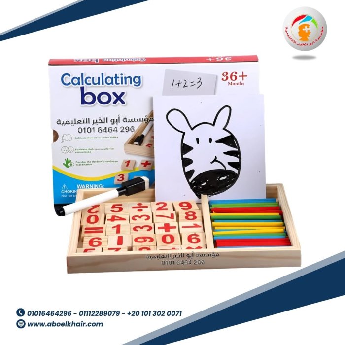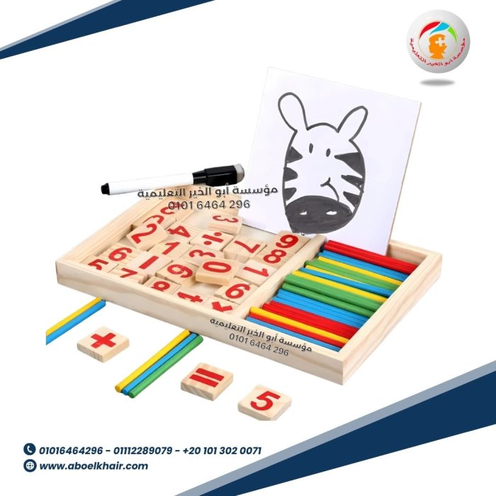 مكعبات خشبية عالية الجودة، بالإضافة إلى عصيان ملونة تساعد الأطفال في تعلم العمليات الحسابية مثل الجمع والطرح.  منهجية منتسوري التي يساعد علي التعلم العملي والتجريبي،