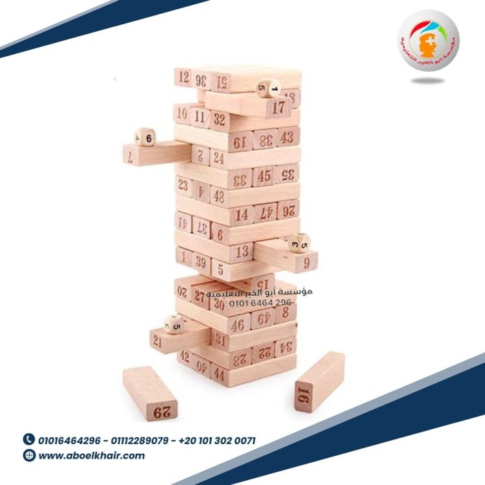 يضرب الزهر الارقام التي تظهر يقوم اللاعب بجمعها و الناتج هو الرقم المطلوب سحبه بدن أن يهدم البرج