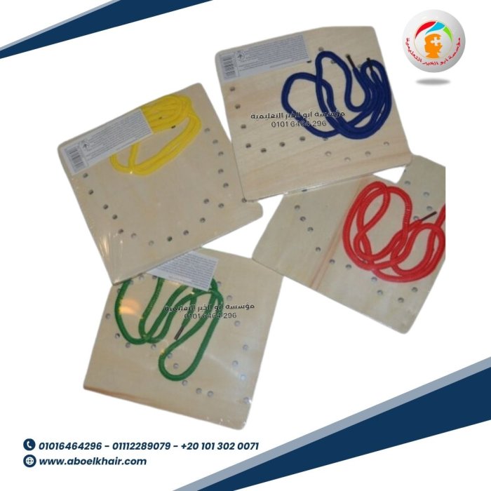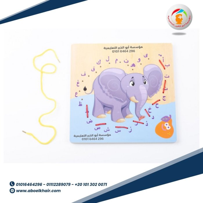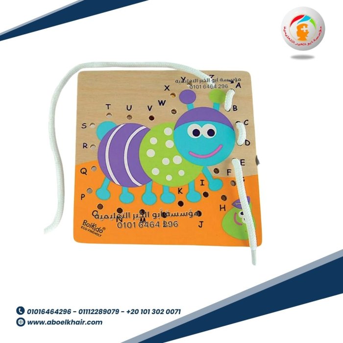 لعبة لضم دودة الحروف العربية مناسبه للتآزر البصري الحركي لتنسيق حركة اليد في مرحلة ماقبل الكتابة عبارة عن قاعدة خشبية متينة مخرمة ومزودة بالحروف العربية + 2 حبال متينة للضم