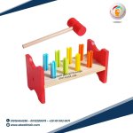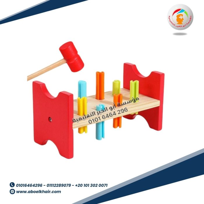 يقوم الطفل بضرب الاوتاد الملونة المختلفة المثبتة على سطح الطاولة بواسطة المطرقة الخشبية في اليدين