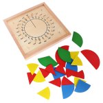 تحتوي على خمس مجموعات كسور: ١/٢، ١/٣، ١/٤، ١/٦، ١/٨. لوحة خشبية مطبوعة عليها الكسور والدرجات، بألوان زاهية وأشكال متنوعة.