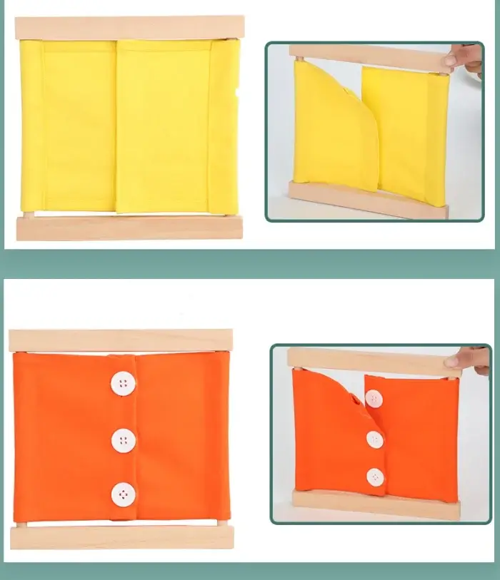 الهدف المباشر من استخدام إطارات مونتيسوري لتغيير الملابس هو مساعدة الأطفال وتشجيعهم على ارتداء ملابسهم باستقلالية. ومن خلال ذلك، يتطور الأطفال بشكل غير مباشر في المهارات الحركية الدقيقة والتنسيق بين اليد والعين. يركز كل إطار على جانب واحد من جوانب تغيير الملابس. إطارات مونتيسوري لتغيير الملابس مصنوعة من قماش قطني متين مثبت على إطارات من خشب الزان.