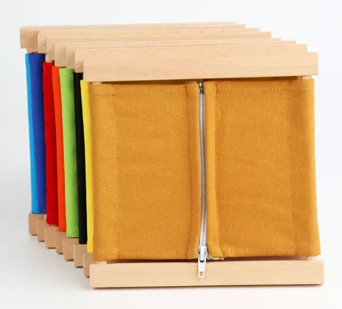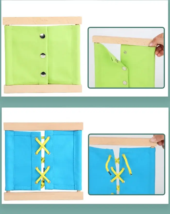 تعلم الأطفال كيفية ربط أدوات الملابس المختلفة وتساعدهم على تطوير المهارات الحركية الدقيقة الدرجات/الأعمار: من مرحلة ما قبل الطفل / 12 شهرًا. – 18 شهرًا. إلى طفل صغير / 18 شهرًا. – 3 سنوات.
