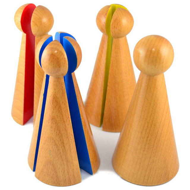 تحتوي المجموعة على أسطوانة، ومكعب، وبيضاوي، ومخروط، وكرة، وهرم مربع القاعدة، وهرم مثلث القاعدة، وبيضاوي، ومنشور مستطيل، ومثلث. تُهيئ الأشكال الهندسية الطفل للهندسة، وتتيح له مقارنة الأشكال ثلاثية الأبعاد المختلفة، كما تُهيئه بشكل غير مباشر لدراسات لاحقة في الرياضيات، وخاصةً الهندسة، من خلال تحديد الأشكال الهندسية واستكشاف العلاقات بين أسطحها المستوية والمنحنية.