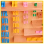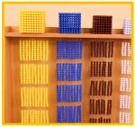 صندوق ذو تسعة أقسام بغطاء، يحتوي على ١٠ حبات من كل شريط خرز ملون من ١ إلى ٩. هذه الخرزات، بالإضافة إلى مربعات الأرقام، مكونات ضرورية لأداء الأنشطة. العمر 3.5:6