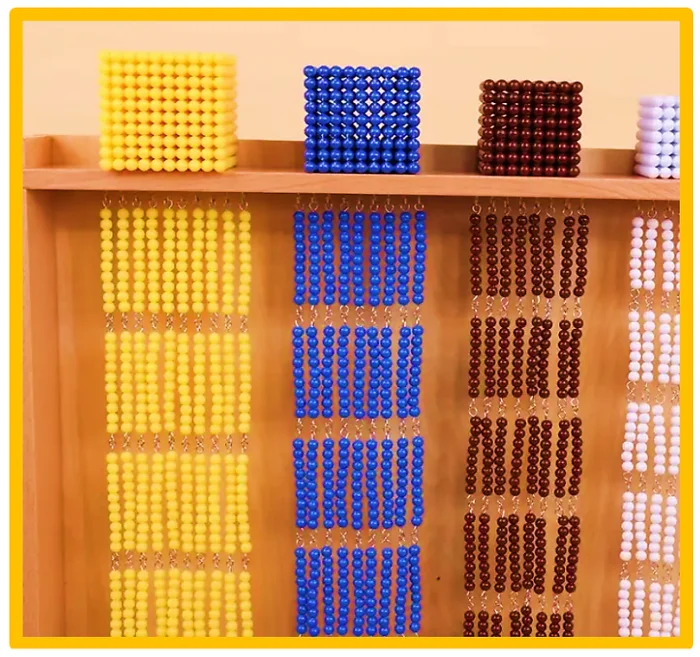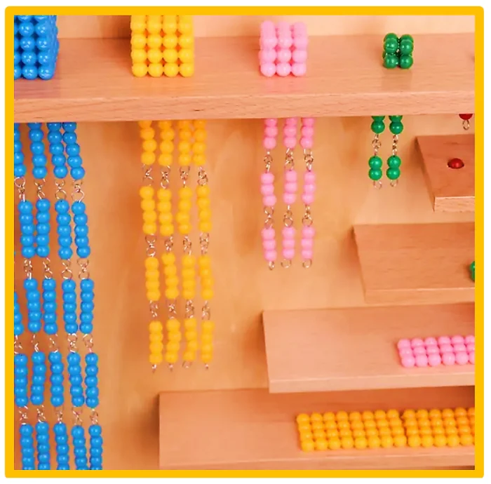 يساعد إطار الخرز الصغير الطفل على الانتقال من فهم شبه تجريدي إلى فهم أكثر تجريدية للنظام العشري، والجمع والطرح والضرب والقسمة لآلاف الأعداد. يتكون من إطار خشبي صلب مع 4 صفوف من الخرز تمثل الآحاد والعشرات والمئات والآلاف. لمزيد من التمارين بالإضافة إلى ذلك، الطرح والضرب. العمر 6:9