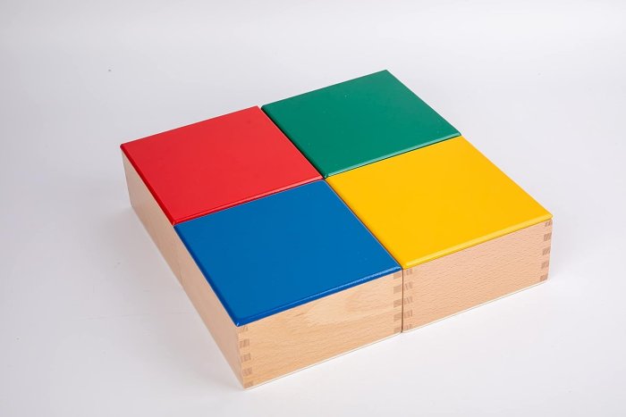 (الصندوق الأول) ٣ أزواج من الألوان الأساسية: تعليم الألوان الأساسية الثلاثة. (الصندوق الثاني) ١١ زوجًا من الألوان: تعليم الألوان الأساسية والثانوية. (الصندوق الثالث) ٦٣ لوحًا تمثل ٩ ألوان بسبع درجات مُدرجة، لتعليم كيفية تصنيف درجات الألوان الأساسية والثانوية.