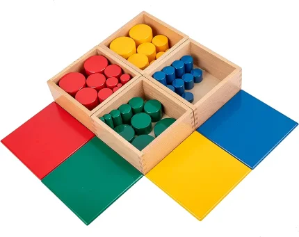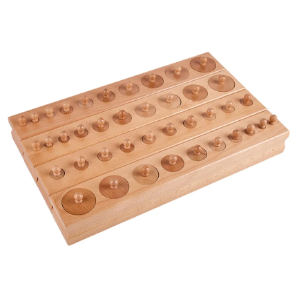 تتيح الأسطوانات بدون مقابض للأطفال تجربة اختلافات الارتفاع والعرض، وتساعدهم على تحسين مهارات التنسيق والتركيز والاستقلالية وحل المشكلات من خلال الملاحظة. تحتوي كل مجموعة على 4 مجموعات من 10 أسطوانات، كل منها متفاوتة في الارتفاع والقطر. توجد كل مجموعة في صندوق خشبي منفصل بغطاء مطلي بنفس لون الأسطوانات: الأحمر والأخضر والأصفر والأزرق. العمر 3:6