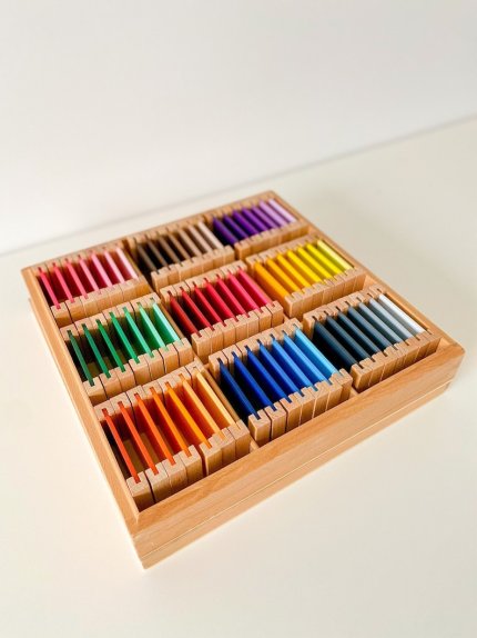 يُعد تدرج الألوان في مونتيسوري جانبًا رائعًا من منهج مونتيسوري التعليمي، حيث يركز على تطوير التمييز البصري للألوان لدى الطفل. من خلال استخدام الأجهزة اللوحية الملونة، يتعلم الأطفال التمييز والمطابقة بين الظلال المختلفة، بدءًا من الألوان الأساسية في المربع الأول وحتى مجموعة واسعة من الألوان في المربعات اللاحقة. لا يساعد هذا النشاط في التعرف على الألوان فحسب، بل يساعد أيضًا في فهم التدرجات وكثافات الألوان، حيث يقوم الأطفال بترتيب الأجهزة اللوحية بتسلسل من التشبع المتزايد أو المتناقص. يعزز هذا التمرين الحسي قدرتهم على ملاحظة وتقدير الاختلافات الدقيقة داخل طيف الألوان.
