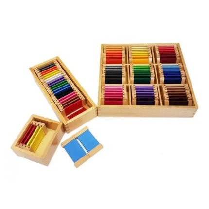 (الصندوق الأول) ٣ أزواج من الألوان الأساسية: تعليم الألوان الأساسية الثلاثة. (الصندوق الثاني) ١١ زوجًا من الألوان: تعليم الألوان الأساسية والثانوية. (الصندوق الثالث) ٦٣ لوحًا تمثل ٩ ألوان بسبع درجات مُدرجة، لتعليم كيفية تصنيف درجات الألوان الأساسية والثانوية.