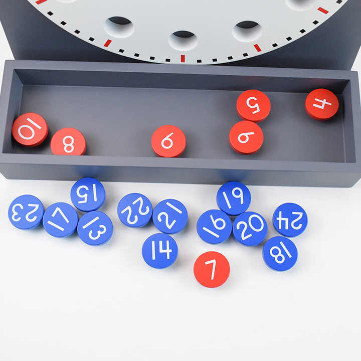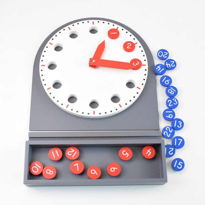 تحتوي هذه المجموعة على حامل خشبي مع صينية تخزين لوضع الأرقام، ووجه ساعة خشبي بعقارب متحركة، و12 رقمًا خشبيًا أحمر (يمثل من 1 إلى 12 ساعة) و12 رقمًا خشبيًا أزرق يمثل 13 إلى 24 ساعة.