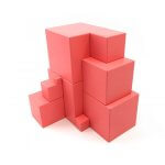 يدعو الطفل لتجربة أبعاد من ١ سم٣ إلى ١٠ سم٣، مما يسمح له بفهم عواقب الاضطراب، ويساعد على تحسين التنسيق والتركيز والاستقلالية ومهارات حل المشكلات من خلال الملاحظة. ١٠ مكعبات خشبية مطلية باللون الوردي، بعرض يتدرج من ١ سم إلى ١٠ سم بزيادات ١ سم. يتضمن مكعبًا إضافيًا بقطر ١ سم.