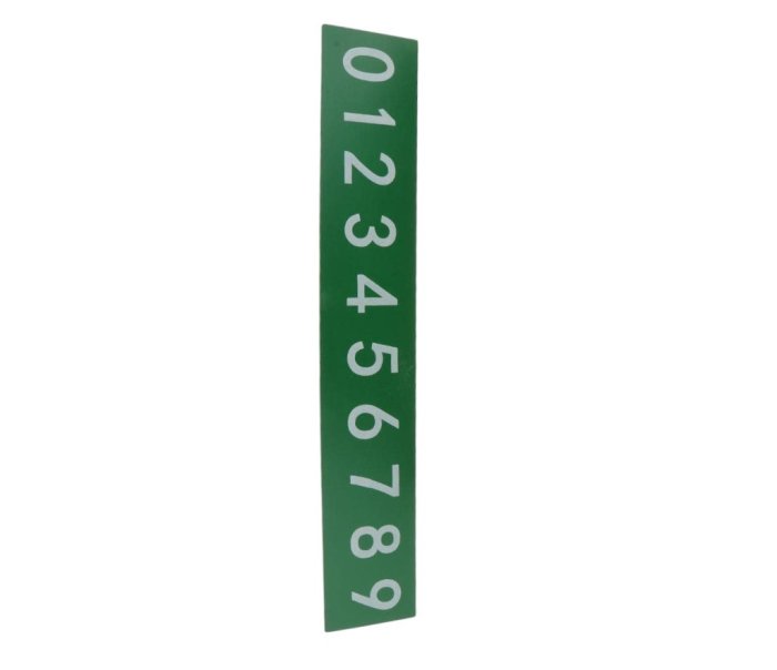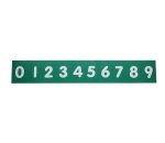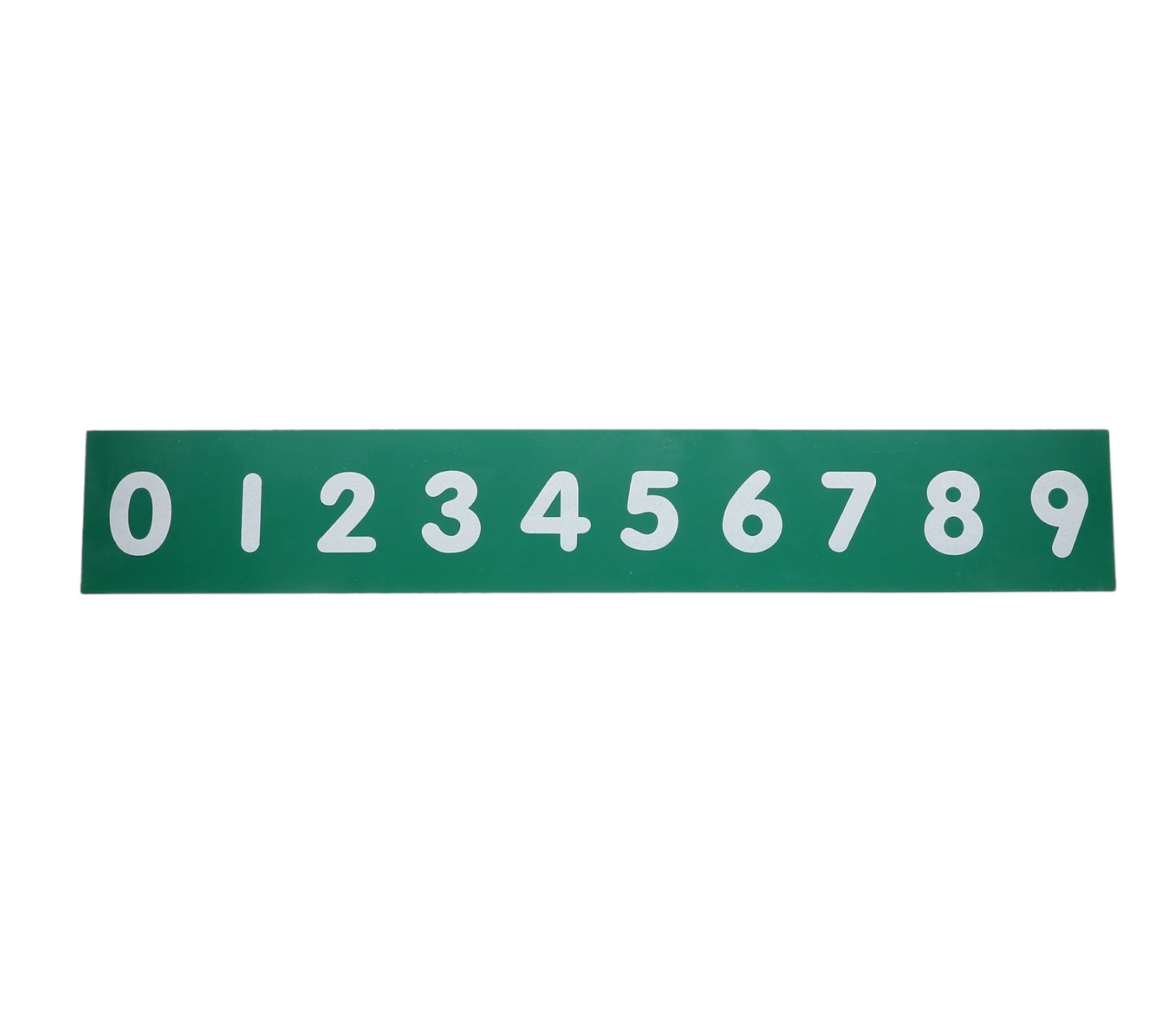 عشرة أرقام من ٠ إلى ٩ مطبوعة على ورق صنفرة على مسطرة خضراء.