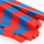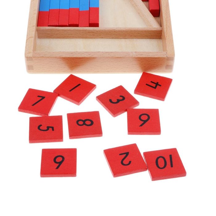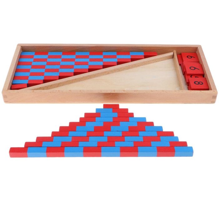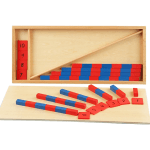 استخدامها في الجمع والطرح. تساعد الأطفال على تعلم الجمع والطرح باستخدام أعمال مألوفة. تحتوي المجموعة على مجموعتين من قضيبين خشبيين صغيرين، مقسمين إلى وحدات بالتناوب بين اللونين الأحمر والأزرق. القضبان ثابتة في الارتفاع والعرض (1 سم)، وتتراوح أطوالها من 2.5 سم إلى 25 سم. تُحفظ القضبان في صندوق خشبي بغطاء.