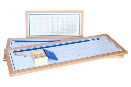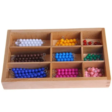 صندوق ذو تسعة أقسام بغطاء، يحتوي على ١٠ حبات من كل شريط خرز ملون من ١ إلى ٩. هذه الخرزات، بالإضافة إلى مربعات الأرقام، مكونات ضرورية لأداء الأنشطة. العمر 3.5:6