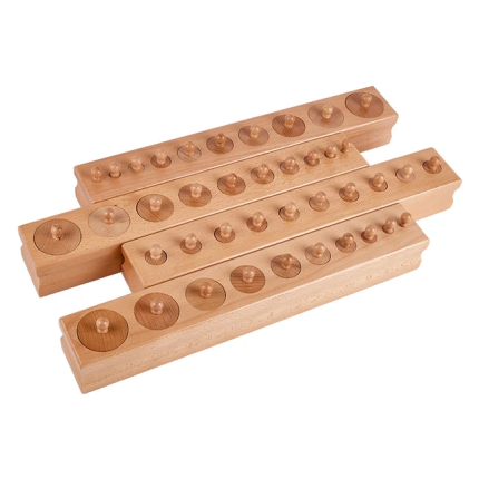 The Montessori knobbed cylinders are a classic sensorial activity designed to assist children in developing their fine motor skills, visual discrimination, and spatial awareness. These sets typically consist of wooden blocks with variously sized holes to fit the corresponding cylinders, which are equipped with knobs for easy handling. As children engage with these materials, they learn to recognize and differentiate sizes and dimensions, laying a foundational understanding of mathematical concepts. The knobbed cylinders are not only educational but also provide a hands-on experience that encourages concentration and independent learning.