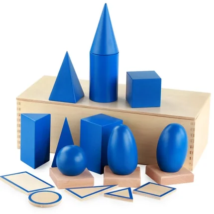 trigonometry work, They serve as a sensorial material that helps children develop their stereognostic sense and prepare for more advanced geometry work. Through hands-on exploration, children can discover how three-dimensional shapes relate to two-dimensional ones, laying a foundation for understanding spatial relationships and mathematical concepts.