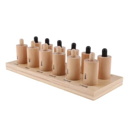 the pressure cylinders are a sensorial educational tool designed to help children develop their sense of touch and learn to discriminate between different levels of pressure. These cylinders come in pairs, each with a spring-loaded plunger that provides varying degrees of resistance. Children press down on the plungers to sense the difference in pressure, which aids in pairing and grading activities. This hands-on learning material is typically made of high-quality wood and is used to enhance fine motor skills and concentration in young learners. Montessori materials like these pressure cylinders are widely recognized for their role in promoting active, self-directed learning.