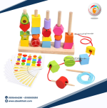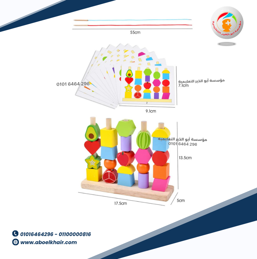 • متعة التكديس: قم ببناء أبراج ملونة عن طريق تكديس الفواكه والأشكال على أوتاد خشبية، مما يشجع المهارات الحركية الدقيقة.