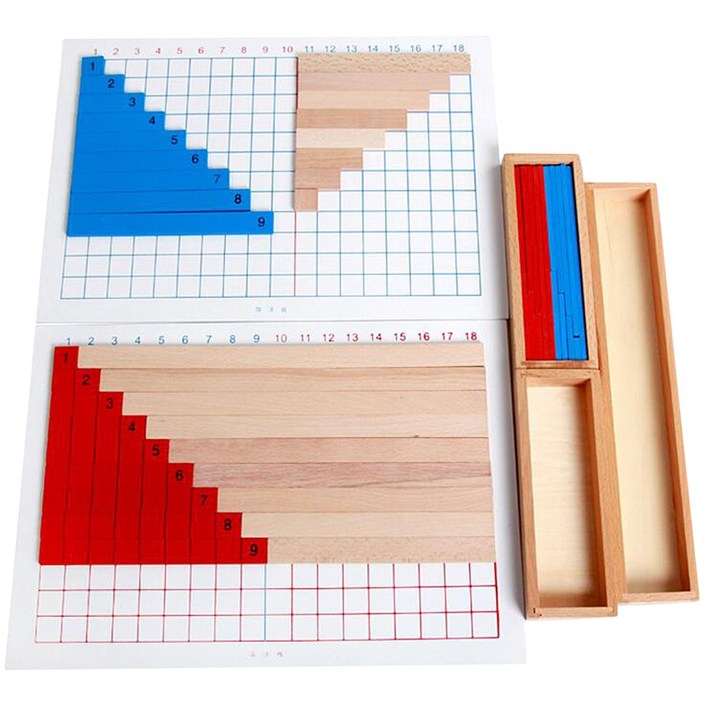 تساعد لوحة الجمع والطرح الطفل على فهم أساسيات الجمع والطرح، وتُهيئه لمهارات رياضية أكثر تجريدًا. تحتوي المجموعة على: لوح خشبي (١٢ مربعًا × ١٨ مربعًا) مطبوع عليه الأرقام من ١ إلى ١٨؛ وصندوق خشبي يحتوي على ٩ شرائط خشبية حمراء و٩ شرائط خشبية زرقاء بأطوال مختلفة، مطبوع عليها الأرقام من ١ إلى ٩. وصندوق خشبي يحتوي على ١٨ شريطًا خشبيًا بتشطيب طبيعي بأطوال مختلفة.