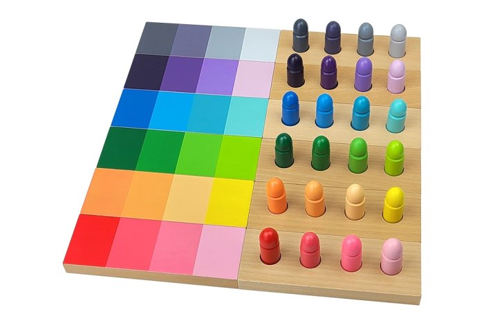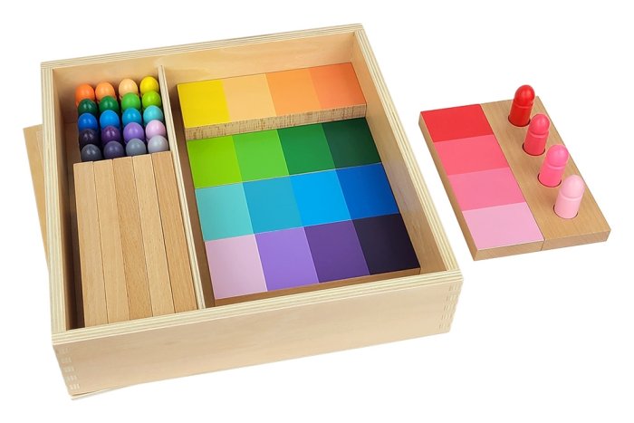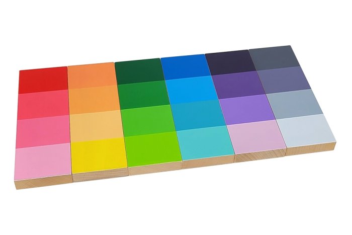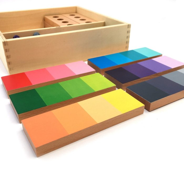 Montessori color grading is a fascinating aspect of the Montessori educational approach, focusing on developing a child’s visual discrimination of colors. Through the use of color tablets, children learn to distinguish and match different shades, from the primary colors in the first box to a wide range of hues in subsequent boxes. The activity not only aids in recognizing colors but also in understanding gradients and intensities, as children arrange the tablets in sequences of increasing or decreasing saturation. This sensorial exercise enhances their ability to observe and appreciate the subtle differences within the color spectrum.