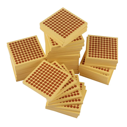 Wooden square of 100 in 45 pieces. An affordable alternative to the golden bead square of 100. Each square is double-sided, displaying 100 units on each side. Age 3.5 :6