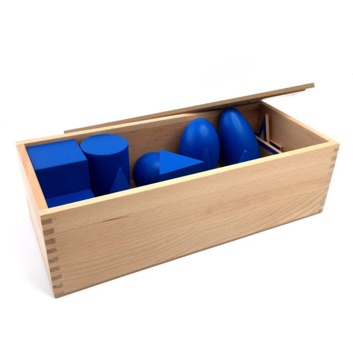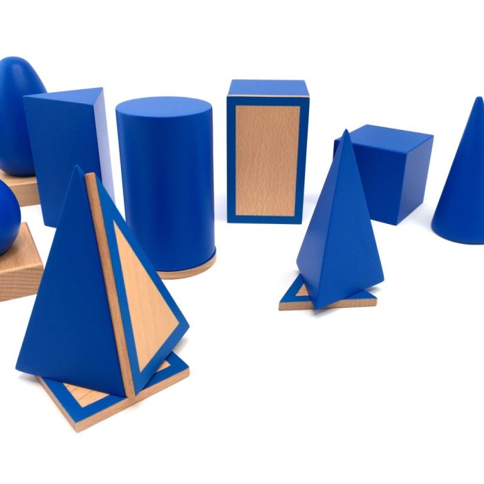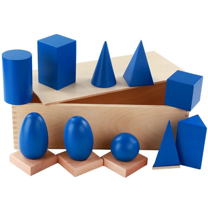 trigonometry work, They serve as a sensorial material that helps children develop their stereognostic sense and prepare for more advanced geometry work. Through hands-on exploration, children can discover how three-dimensional shapes relate to two-dimensional ones, laying a foundation for understanding spatial relationships and mathematical concepts.