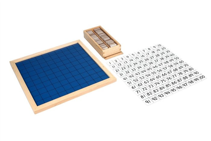 framed blue wooden board with 100 squares and a wooden box