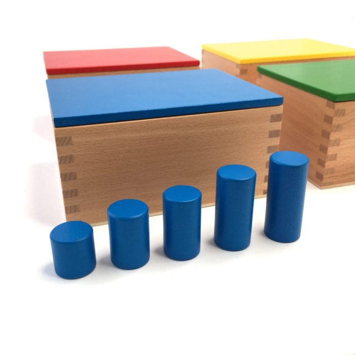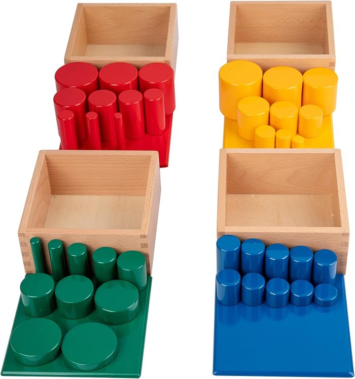 The Montessori Knobless Cylinders are a set of colorful educational tools designed to enhance a child’s ability to discern differences in dimension, such as height and diameter. Comprising four sets of ten cylinders, each varying in one or two dimensions, these materials are integral to the Montessori method of teaching. They not only aid in developing a child’s visual discrimination skills but also serve as a hands-on approach to learning about spatial relationships, size, and proportion.