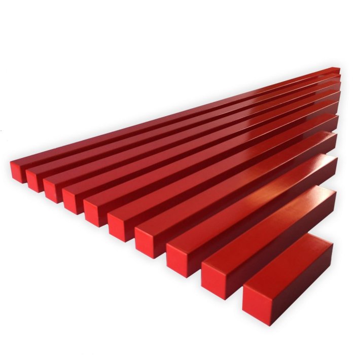 The Montessori Red Rods are a classic sensorial material in the Montessori curriculum, designed to help children develop visual discrimination of size, understand mathematical concepts such as length and sequence, and refine their fine motor skills. Each set consists of ten rods that increase in length from 10 centimeters to 100 centimeters, all uniformly painted in red to visually emphasize length without the distraction of varying colors. Through activities like ordering the rods from shortest to longest, children learn to assess dimensions and appreciate incremental differences, laying a foundation for more complex mathematical understanding.