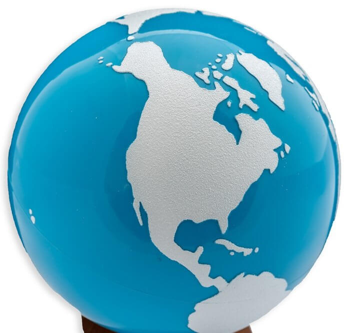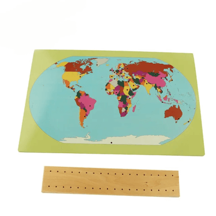 Jigsaw world map Children begin to build their knowledge of the world’s geography. puzzle map is part of The Montessori geography material and shows both hemispheres and the colors of the Continents correspond with those of the globe of the continents, allowing comparison of The round shape of the globe and the flat depiction of the earth on the puzzle. Age 4+