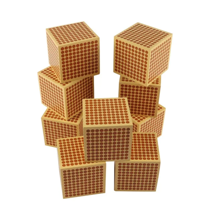 Golden bead thousand cube The units, ten bars, hundred squares, and thousand cubes can be used to demonstrate place value, numeral composition, or mathematical equations of thousand numbers.