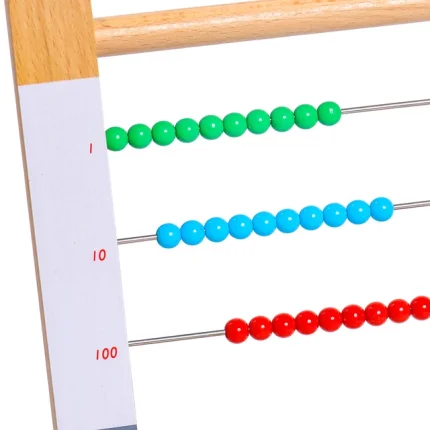 The large bead frame forms the bridge to abstraction for the decimal system exercises of multiplication. Age 6:9